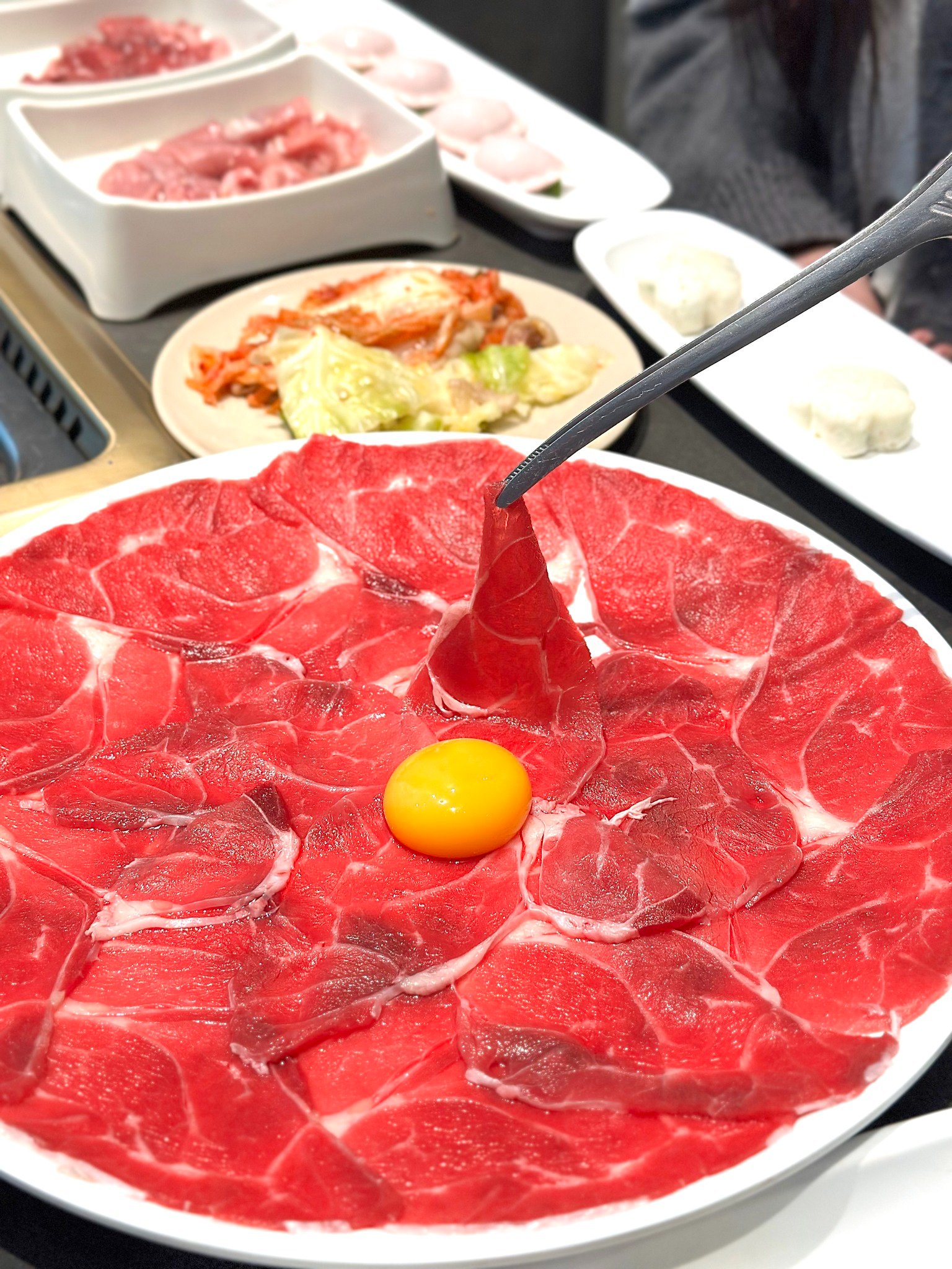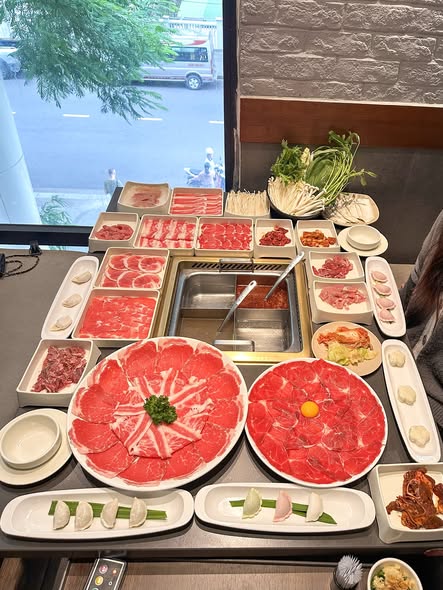 Buffet chỉ từ 299K/người mà được hơn 50 món nhúng đủ từ thịt bò, thịt heo, nội tạng, rau nấm, đồ viên, mì, đậu,... Còn ai thích ăn bò tươi thái tay không giới hạn có thể chọn buffet 479K/người, no nê phủ phê