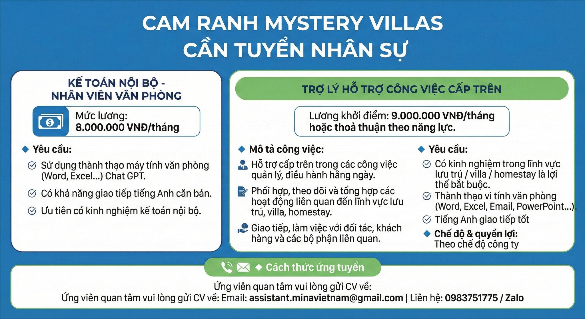 Có kinh nghiệm trong lĩnh vực lưu trú / villa / homestay là lợi thế bắt buộc.