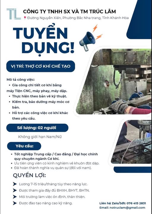 Địa điểm làm việc: Công ty TNHH Sản xuất và Thương mại Trúc Lâm, Gần Trường Trung cấp kỹ thuật miền Trung, Đường Nguyễn Xiển, Phường Bắc Nha Trang, Tỉnh Khánh Hòa.