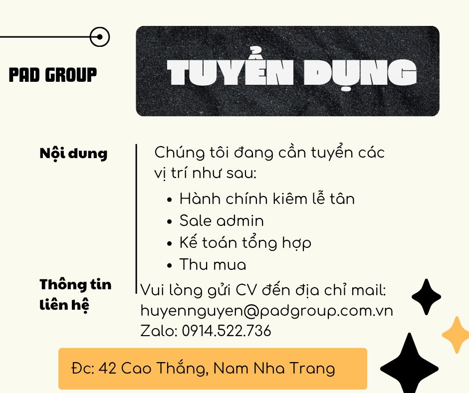 NHA TRANG – TUYỂN GẤP NHÂN SỰ NHIỀU VỊ TRÍ Công ty In & Sản xuất Bao bì Thái Bình Dương Làm việc: 42 Cao Thắng, Phước Long, Nha Trang Vị trí tuyển dụng: Nhân viên Thu mua – 02 người Kinh nghiệm thu mua từ 01 năm Ưu tiên từng làm ngành sản xuất Sale Admin – 01 người Có kinh nghiệm làm báo cáo. Ưu tiên từng làm trong nhà máy / sản xuất Kế toán thuế – 01 người Có kinh nghiệm >3 năm Thời gian làm việc: Thứ 2 – sáng Thứ 7 (07h30–11h30 | 12h30–16h30) Gửi CV: huyennguyen@padgroup.com.vn
