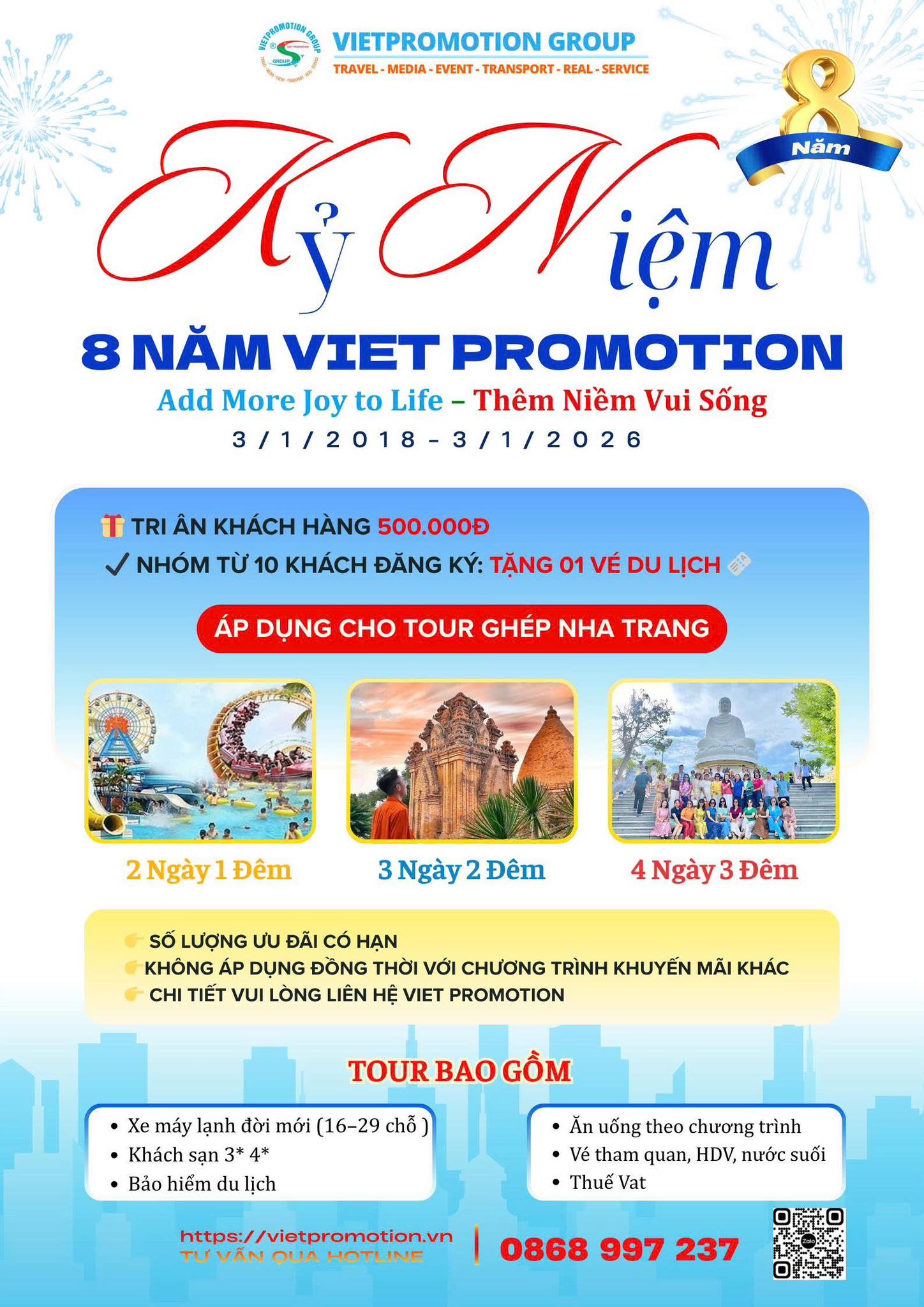 8 năm một hành trình – Vietpromotion Group tự hào được đồng hành cùng Quý khách trên từng chuyến đi, từng khoảnh khắc đáng nhớ. Nhân dịp kỷ niệm 8 năm thành lập (03/01/2018 – 03/01/2026), chúng tôi trân trọng gửi đến Quý khách chương trình khuyến mại đặc biệt như một lời cảm ơn chân thành
