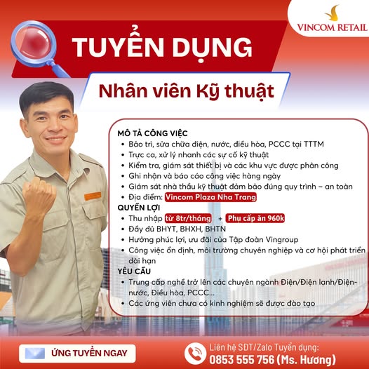 Nhân viên Kỹ thuật (Thu nhập hấp dẫn + 960k trợ cấp ăn) Có BHXH – BHYT – BHTN, môi trường chuyên nghiệp Liên hệ ngay qua : 0853.555.756 (Ms. Hương)